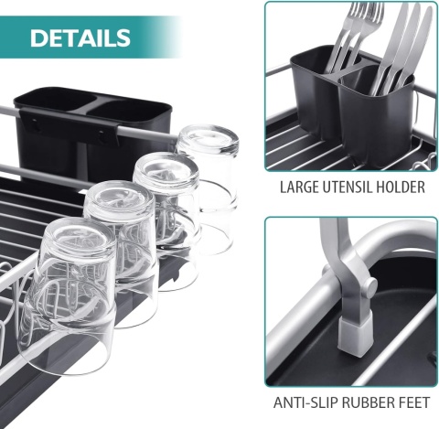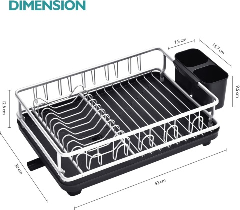 - Materiał premium: Ten kuchenny stojak na naczynia jest wykonany z doskonałej aluminiowej ramy, która jest odporna na rdzę i wystarczająco wytrzymała, lżejsza niż stojak na naczynia ze stali nierdzewnej. Cztery antypoślizgowe gumowe nóżki chronią zlewozmywak i blat przed zadrapaniami i przesuwaniem. Ruchomy uchwyt na przybory do zorganizowanego i oddzielnego suszenia, który może zaspokoić Twoje dodatkowe potrzeby. Uwaga: 42 (dł.) x 30 (szer.) x 12,5 (wys.) cm.