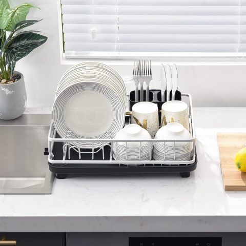 - Oszczędność miejsca i łatwe czyszczenie: zdejmowany stojak do suszenia naczyń jest podzielony na dwie przestrzenie na sztućce i inne małe przedmioty, może być używany oddzielnie. Możesz umieścić go w zlewie lub gdziekolwiek chcesz, co jest wygodne do dopasowania do wysokości szafki. Dzięki temu stojakowi na naczynia zawsze znajdziesz odpowiednie miejsce na różne zastawy stołowe. To zdecydowanie innowacyjny i kreatywny stojak na naczynia!