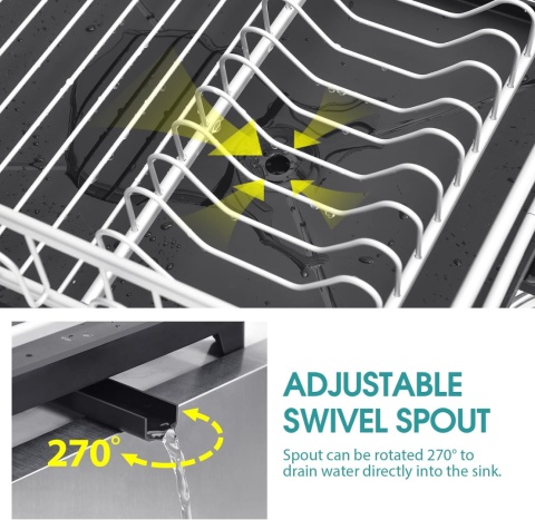 - 【Idealny drenaż】: Kreatywna obrotowa deska odpływowa 270° została zaprojektowana z idealną wysokością, aby uniknąć gromadzenia się wody w stojaku, może zapewnić kilka opcji umieszczania w zależności od projektu zlewu kuchennego. Regulowana wylewka wody może również odprowadzać wodę do zlewu, co pomaga szybko wyschnąć i utrzymać naczynia w porządku.