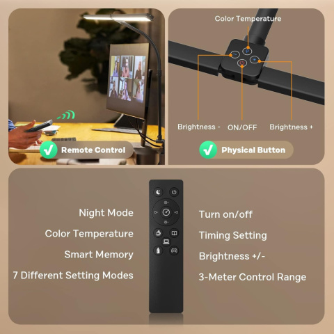 - Przycisk do wciskania i pilota zdalnego sterowania – lampa biurkowa LED APMIEK LED, inteligentny pilot zdalnego sterowania o długości 3 m, wygodne przełączanie między wieloma trybami (czytanie/praca/kawa/jedzenie/gry/noc), specjalna funkcja timera (automatyczne ściemnianie po 3 godzinach), inteligentne przypomnienie (po włączeniu tego samego trybu, co przy ostatnim wyłączeniu).
