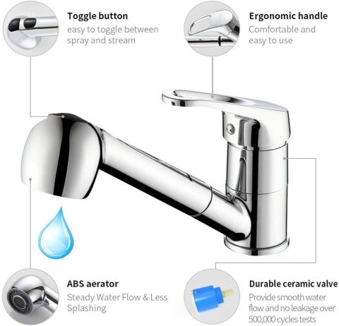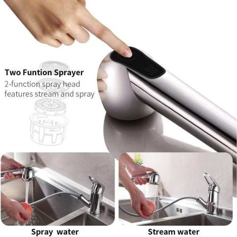 • 2 RODZAJE GRUBY WODY: Baterie kuchenne mają dwie praktyczne funkcje strumienia wody: strumień prysznic i normalny strumień wody. Możesz użyć klasycznej wody do mycia owoców i warzyw lub wody prysznicowej, aby rozjaśnić brud z naczynia i zlewu. Można szybko przełączać za pomocą jednego przycisku.