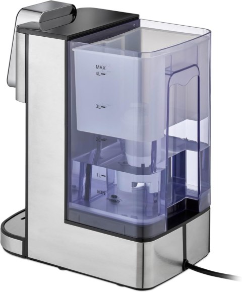 - 7 wydatków ilościowych na pokrycie dostosowane do potrzeb można ustawić za pomocą dotyku: 100 / 150 / 200 / 250 / 300 / 350 / 400 ml i w sposób ciągły. Duży zbiornik na wodę ma pojemność 4 l i jest zdejmowany, łatwy do napełniania i czyszczenia.