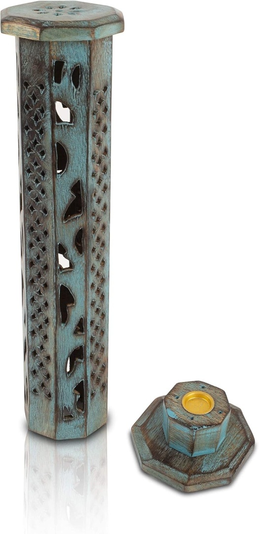 RĘCZNIE WYKONANE I PRZYJAZNE EKOLOGICZNIE - Każda wieża została indywidualnie wykonana ręcznie przez rzemieślników przy użyciu prostych narzędzi do rzeźbienia w drewnie mango, zakupionym z autoryzowanych kanałów rządowych w celu ochrony zarówno środowiska, jak i źródeł utrzymania rzemieślników. Rzemieślnik wykonał szczegółowe małe rzeźby w drewnie, aby umożliwić ciche ulatnianie się zapachów, dodając jednocześnie wymaganych wibracji do każdego miejsca, w którym znajduje się kadzidełko