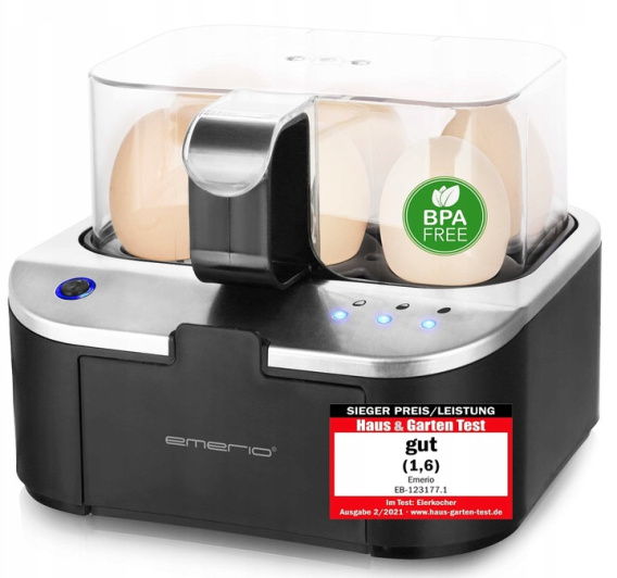 • W pełni automatyczny jajowar z wyjściem światła i głosu w języku niemieckim. Model 2022 ma teraz wzmocnioną pokrywę, która zapewnia większą stabilność kształtu