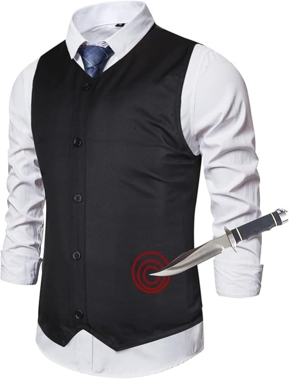 • Ukryty styl: kompaktowy, płaski i lekki design w stylu kamizelki, kamizelkę ochronną można nosić pod kurtkami, pod formalnym ubraniem, ozdobne guziki ułatwiają chowanie się odpornego na przebicie garnituru w formalnym garniturze lub noszeniu kamizelki.