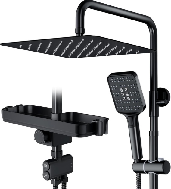 Rainsworth System prysznicowy z półką w kolorze czarnym – 30 x 30 cm prostokątny deszczownica i 3 rodzaje strumienia, z przełącznikiem z mosiądzu, kolumna prysznicowa, zestaw prysznicowy do prysznica\