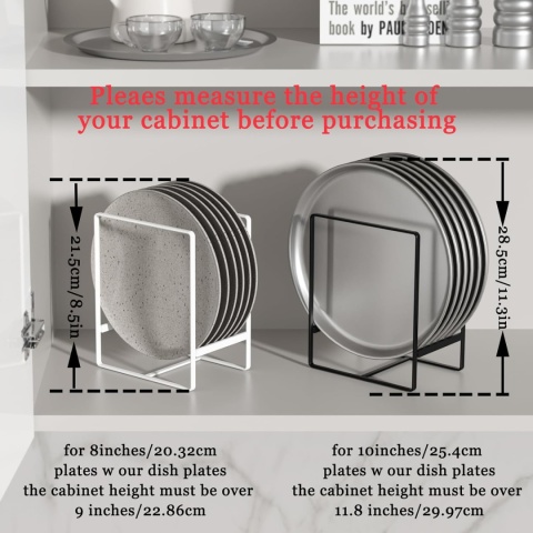 OSZCZĘDŹ MIEJSCE: Te uchwyty na talerze można ustawić na blacie w celu przechowywania; używaj go w szafce, szafce i spiżarni do organizowania. Aby zapewnić lepsze użytkowanie, zapoznaj się z wymiarami produktu (6,4 dł. x 4,5 szer. x 7,9 wys. cala) i przed zakupem zmierz wysokość szafki. W przypadku użycia w szafce, w przypadku płyty o rozmiarze 8 cali, wysokość szafki musi wynosić powyżej 9 cali, w przypadku płyty o rozmiarze 10 cali wysokość szafki musi przekraczać 11,8 cala