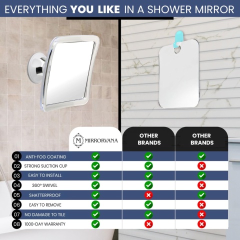 • Jakość Mirrovana. Dzięki naszym wysokiej jakości lusterkom prysznicowym spełnione są nawet najwyższe wymagania dotyczące pielęgnacji ciała. Nasze lustra premium zostały fachowo wyprodukowane i są przeznaczone dla wymagających mężczyzn, którzy chcą absolutnej perfekcji – to doskonały produkt do pielęgnacji ciała.