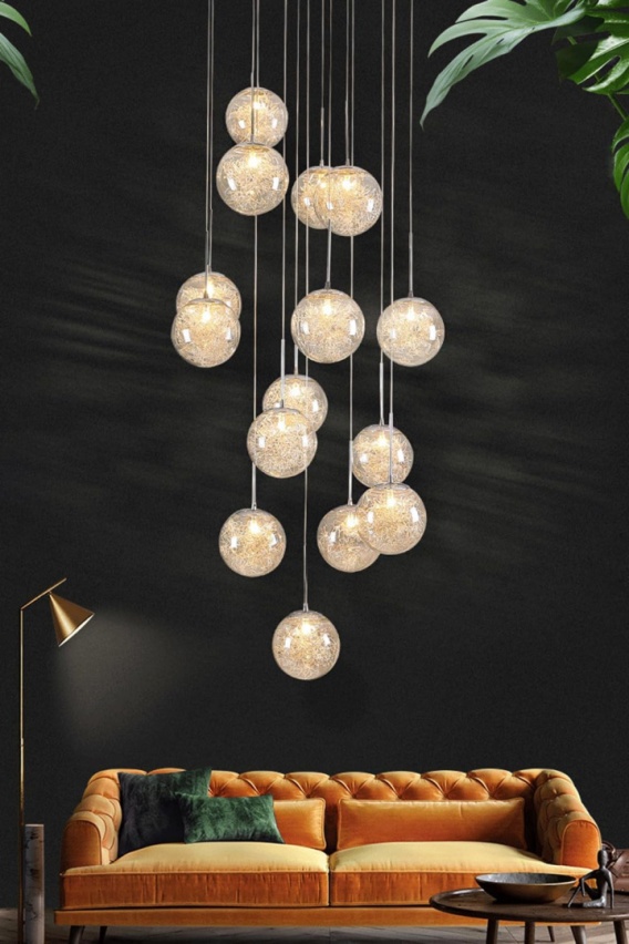 • nowoczesny dekoracyjny żyrandol schodów: z pięknym, nowoczesnym designem długiego wiszącego drutu i wiszącego szklanego światła kulki, daj swojemu domowi wzmocnienie oświetlenia z tym dekoracyjnym żyrandolem schodowym. długość wiszącego drutu można dostosować tak, aby pasowało do każdej przestrzeni. emitowane światło jest pochlebne i kojące.