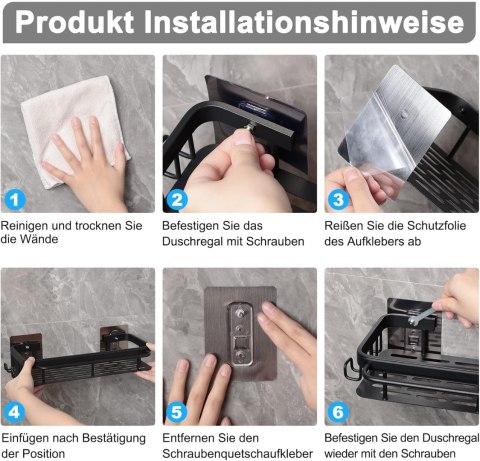 - Półka prysznicowa w kosmosie aluminium: Kosz prysznicowy jest wykonany z kosmicznego maluminium, ręcznie polerowany, anodowany, nierdzewny i odporny na zarysowania, odporny na korozję i trwały. Dzięki prostej konstrukcji bez problemu pasuje do istniejącego wyposażenia