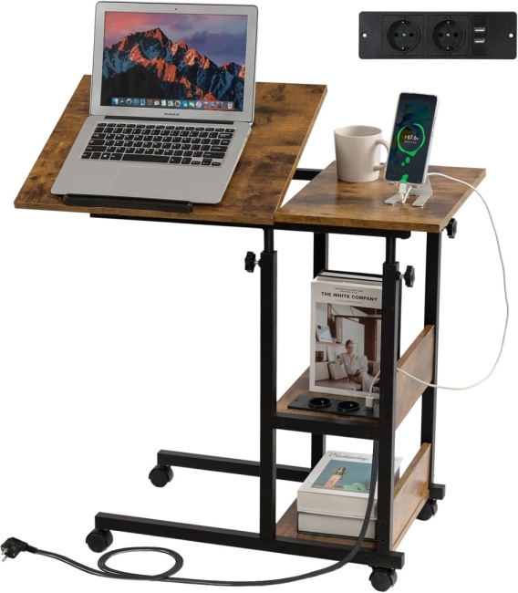 Stolik nocny Hadulcet w kształcie litery C z kółkami, regulowany blat, stolik nocny z gniazdkiem, stolik na sofę z regulacją wysokości, stolik na laptopa z miejscem do przechowywania do salonu i sypialni