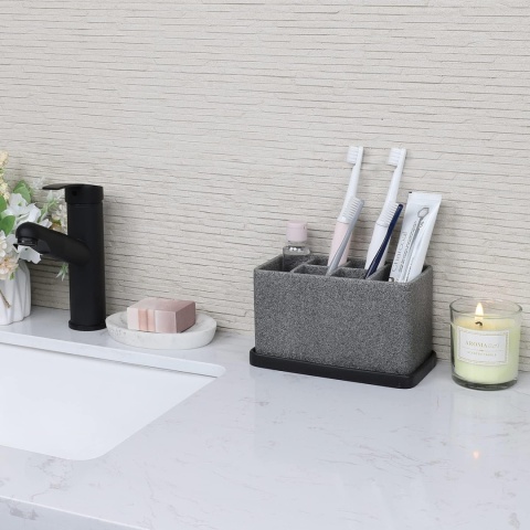 Zestaw uchwytów na szczoteczki do zębów z dolną tacką: Zbiera nadmiar wody, bez odpływów na blacie; tackę można używać samodzielnie, aby trzymać perfumy, makijaż, uchwyt na patyczki kosmetyczne, biżuterię i nie tylko na blacie łazienki i toaletki
