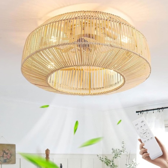 - Wentylator sufitowy z bambusowym oświetleniem: ten wentylator sufitowy jest wykonany z wytrzymałego, ręcznie plecionego bambusa, przy czym skrzydła są idealnie ukryte w kloszu. Wytrzymały i trwały, nie odkształca się. Ten wentylator sufitowy w klatce załamuje idealne światło, zarówno do oświetlenia, jak i dekoracji pomieszczenia.