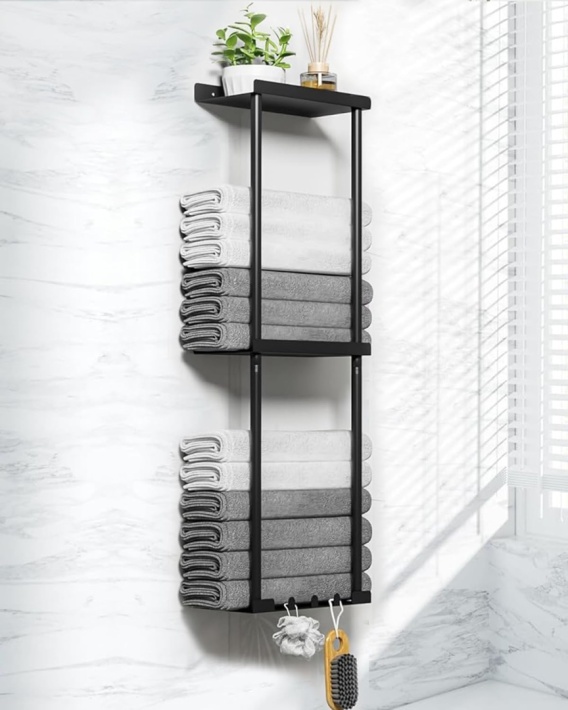 • Ulepszony do 2-poziomowego projektu: Dwuwarstwowy wieszak na ręczniki umożliwia przechowywanie ręczników w różnych kategoriach dla łatwego dostępu. Warstwowy design wieszaka na ręczniki nie można zamówić ręczników, ręczniki można układać jeden na drugim. Nie jest łatwo sięgnąć po dolne ręczniki