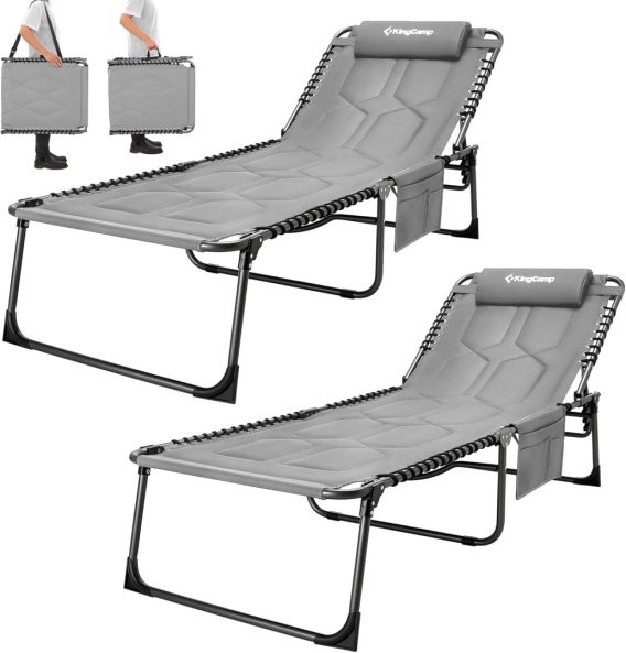 KingCamp Nadwymiarowy leżak składany z 5-stopniową regulacją Leżak ogrodowy Leżak trójnożny Leżak kempingowy z poduszką pod głowę i kieszenią boczną, nośność do 150 kg, do ogrodu Zestaw 2 sztuki
