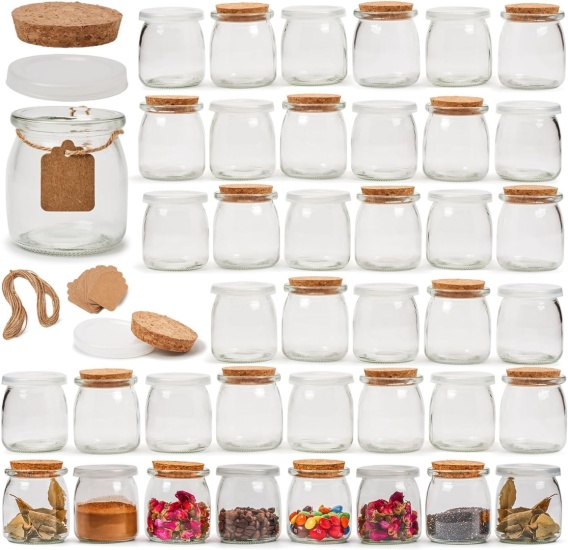 [SZKLANE SŁOIKI NA UPOMINKI] Te atrakcyjne małe dekoracyjne szklane butelki to świetny sposób na stworzenie upominków na imprezy i wydarzenia (ślub / baby shower / świece / wakacje / dekoracje), wiadomości lub życzeń w butelce, stwórz wyjątkowe prezenty dla przyjaciół i rodziny. [PRZEWODNY I PRAKTYCZNY] Zestaw 40 butelek z przezroczystego szkła, aby szybko i łatwo zobaczyć i zlokalizować przechowywane towary. Zawiera 2 pokrywki, pokrywkę korkową i plastikową nasadkę do przechowywania żywności lub przedmiotów. Dołączone etykiety umożliwiają łatwą personalizację, jeśli są używane na wydarzeniach i przyjęciach.