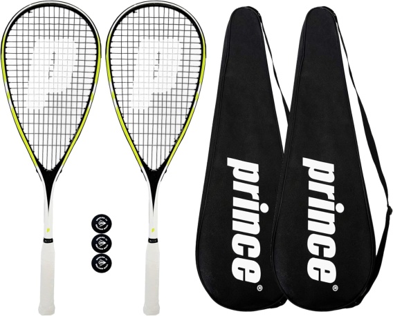 Zestaw rakiet do squasha Prince Team 400 i 450 Twin Set, zawiera pełnowymiarowe pokrowce ochronne na rakietę i 3 piłki do squasha.